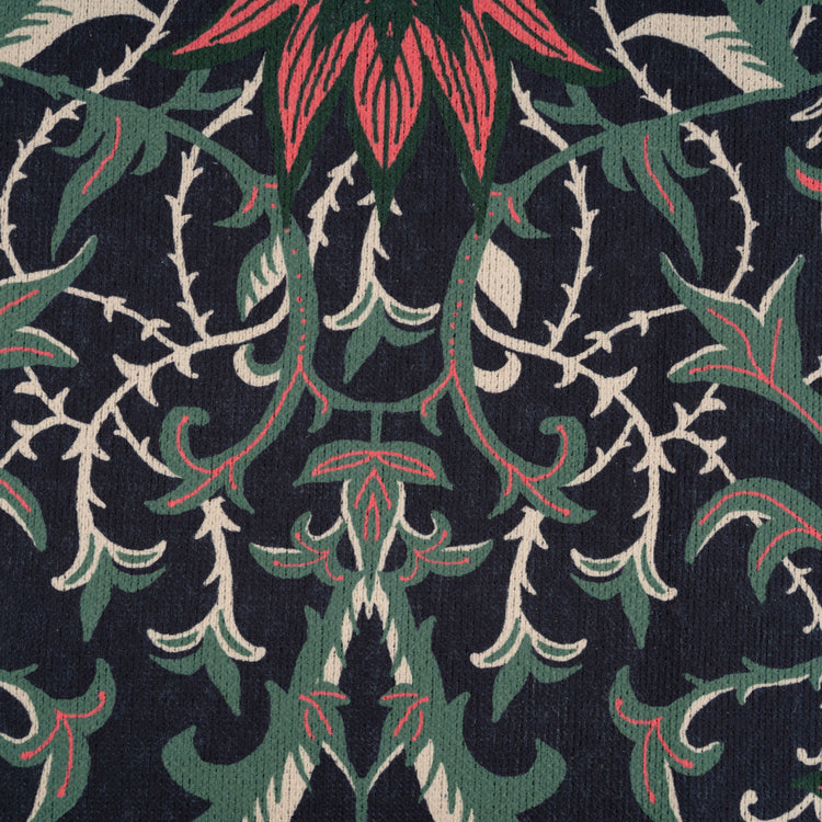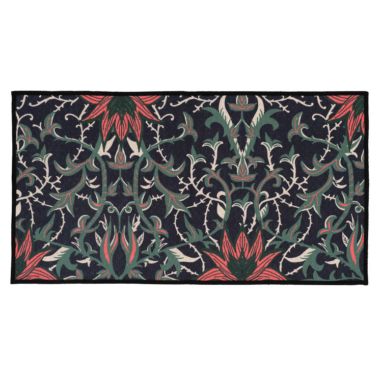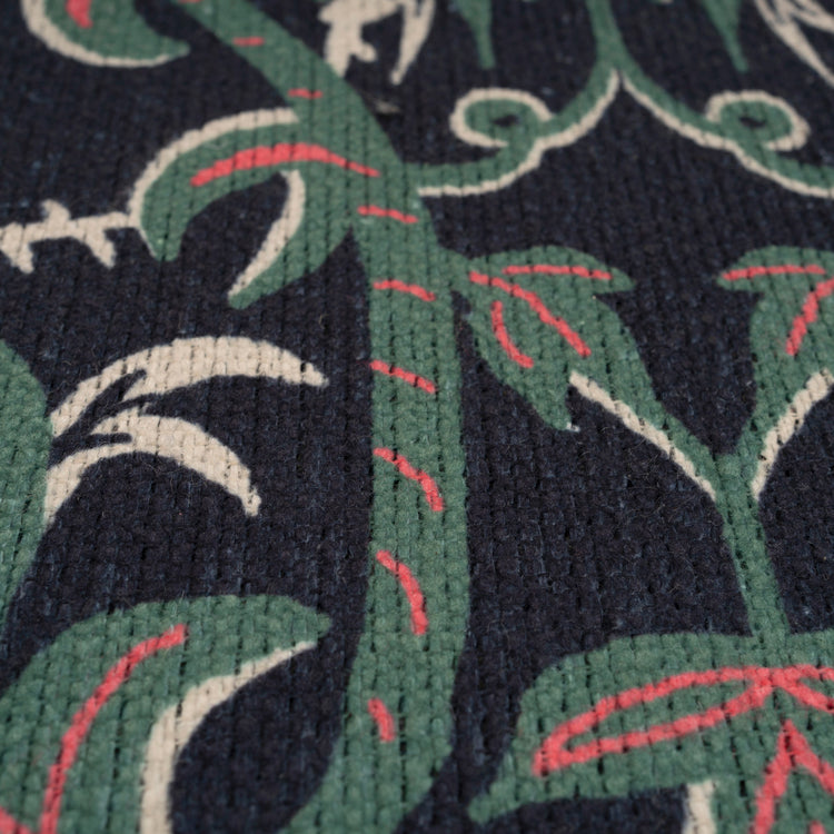 Dark, leafy and a little bit enchanted. Venus is a tangle of deep green vines and coral blooms, unfurling across a navy base like a secret forest floor. Intricate, atmospheric and full of intrigue, these bold botanicals are a true escape. Woven from recycled cotton and polyester with a non-slip backing and liquid repellent surface, style and practicality walk hand in hand.