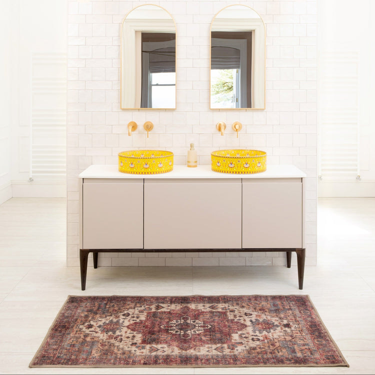 She’s the kind of rug that pulls a bathroom together with confidence and charm. Think stately home elegance meets modern-day trendsetter.