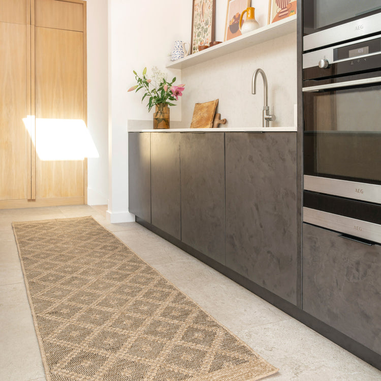 Thea has quiet charisma with her subtle diamond pattern, adding just enough structure to her jute-inspired base. She’s got a Scandi edge and plenty of laid-back charm. This runner rug is perfect for anchoring a neutral living room or adding rhythm to a minimalist bedroom. Spills, crumbs, and muddy footprints? Thea takes it all in stride.