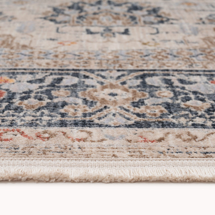 Experience luxury with our Blue Floral Motif Area Rug. Detailed traditional border design and a neutral floral motif bring a sense of regal beauty to your décor. Every intricate detail tells a story of sophistication and elegance, providing your home with an unparalleled air of exclusivity.