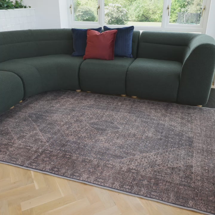 Mabel is effortlessly elegant yet refreshingly down to earth, like the guest who always knows just what to bring. Wrapped in soft beige, taupe, and brown tones, her central medallion and intricate borders whisper timeless charm, while a delicate distressed finish gives her that well-loved, heirloom feel.