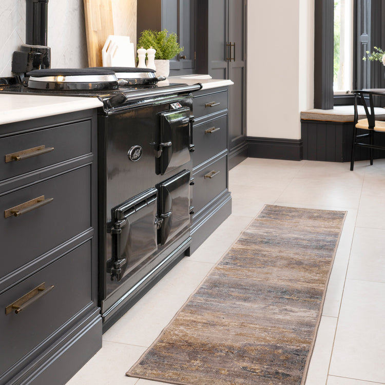 Meet Millie - modern living meets artistic soul. Woven from plush chenille, this runner rugs layered abstract design of stormy greys and blues brushed with aged gold is expressive, balanced and effortlessly stylish. Ideal for interiors embracing modern luxe or tonal layering, she adds a gentle glow and a sense of movement to any room. Quietly striking, undeniably elegant.
