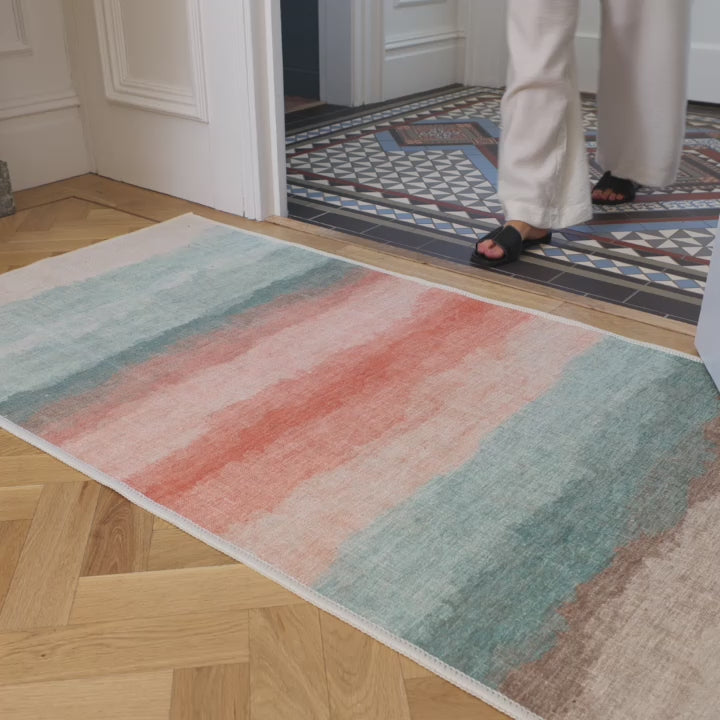 Solene captures the warmth of the morning sunrise on water, a quiet moment of beauty in motion. This rugs contemporary abstract design moves in soft watercolour strokes, with blues and terracotta tones blending and shifting like waves meeting the shore.