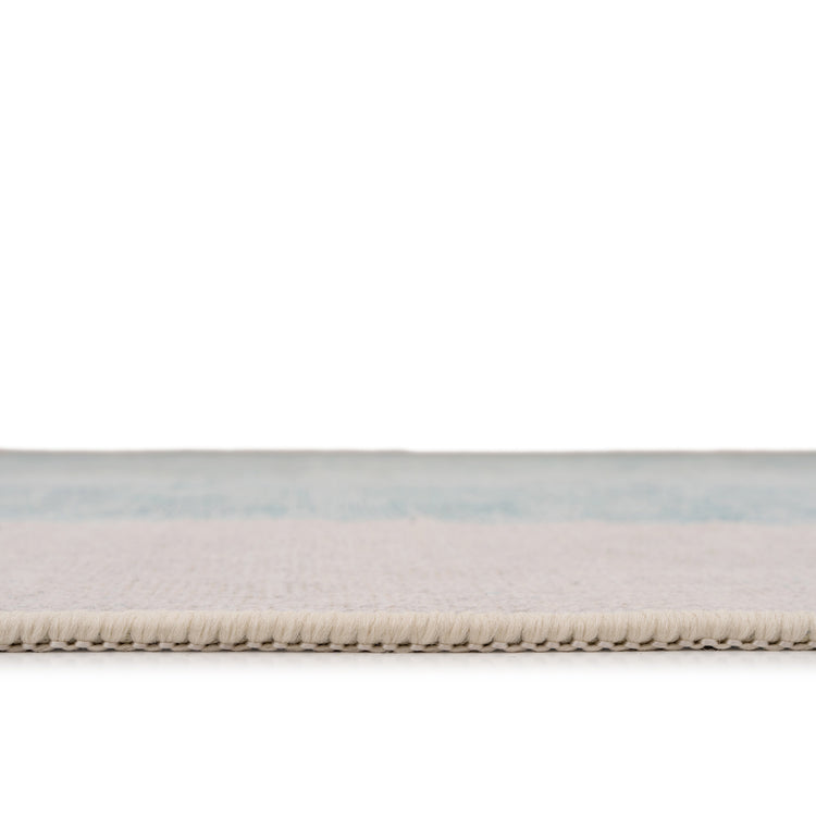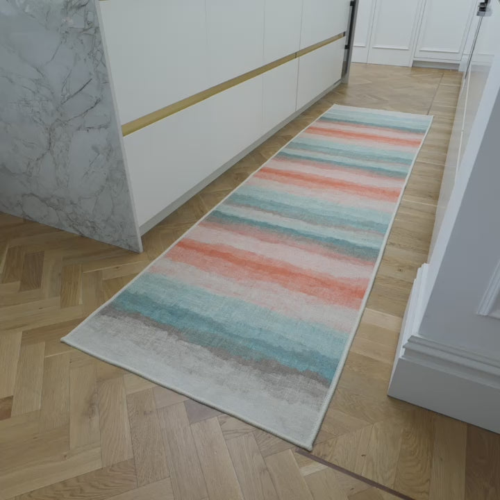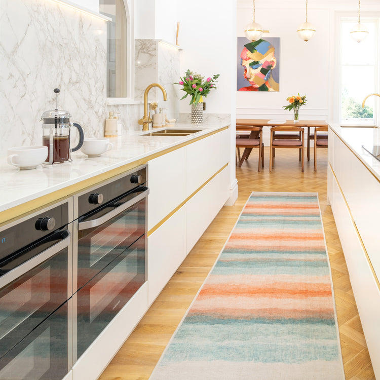 Solene captures the warmth of the morning sunrise on water, a quiet moment of beauty in motion. This hall runner rug contemporary abstract design moves in soft watercolour strokes, with blues and terracotta tones blending and shifting like waves meeting the shore.