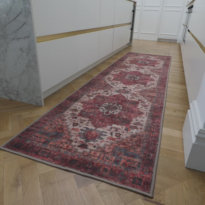 Woven from meltingly soft recycled cotton, this red rug isn’t just about good looks, she’s machine washable and always up for whatever the day throws her way. She feels most at home in traditional or transitional spaces in a hallway or kitchen, glowing under warm lighting and paired with rich wooden furnishings.