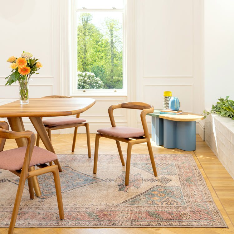 Coralie is the treasure you wish you could’ve squeezed into your suitcase, a vintage Moroccan-inspired gem, filled with stories of sun-drenched souks and hidden market finds. Her geometric motifs and layered borders blend cool blues with warm terracotta, creating that perfect well travelled look.
