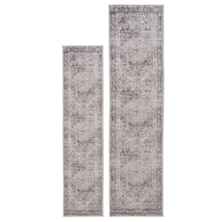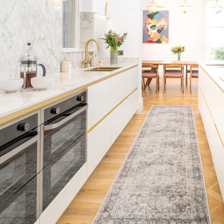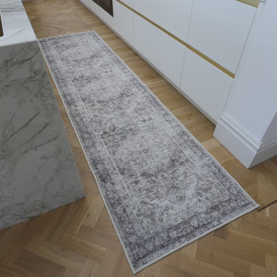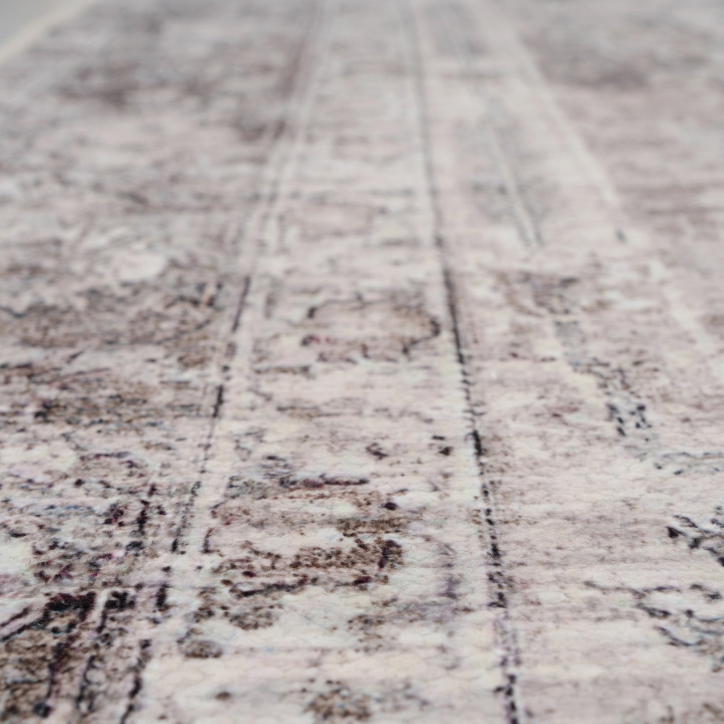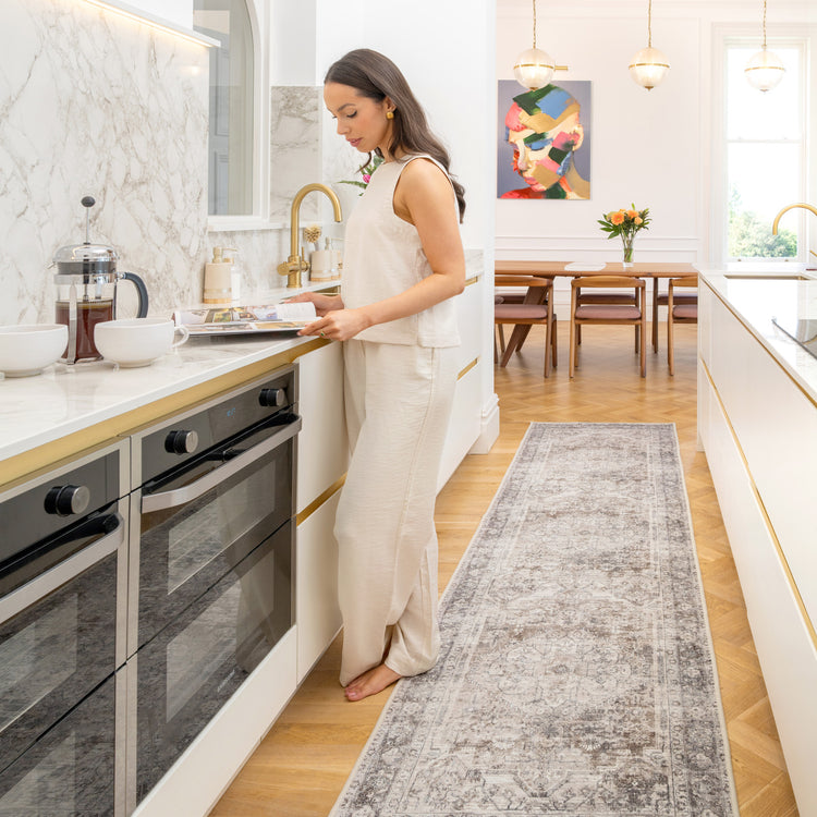 Elsie is that old forgotten friend who feels like no time has passed, sharing stories of yesterday over a hot cup of tea. This rugs ornate vintage design, with a delicately bordered frame and a softly muted central medallion, feels understated yet effortlessly elegant. Fitting seamlessly into any home, no matter the style. Wrapped in silvery greige and warming beige, she’s a quiet beauty, a hidden pearl waiting to be rediscovered.
