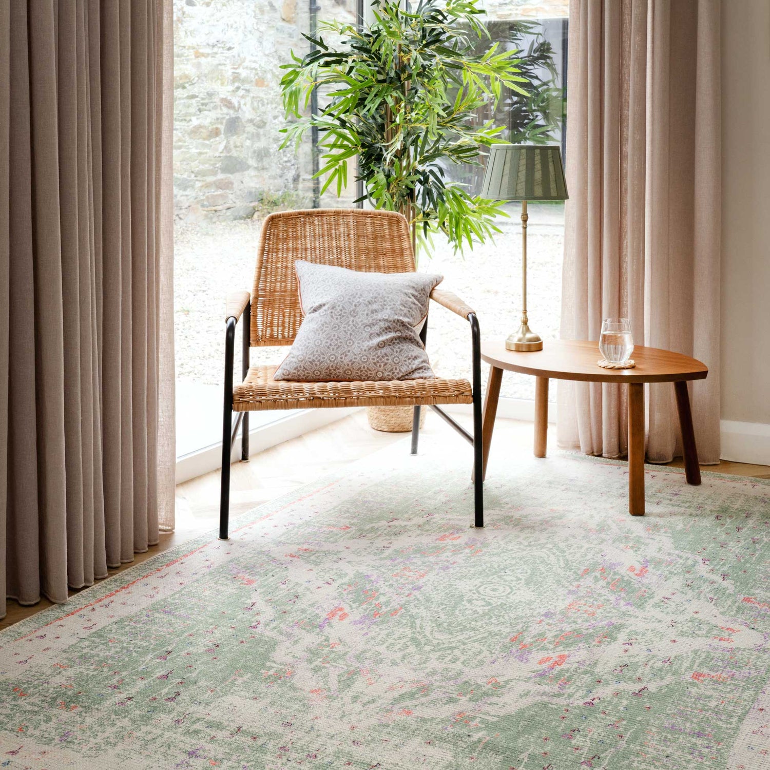 Lottie is the tranquil, happy-go-lucky nature-lover of Flatwoven Washable. She’s having her Cottage Core Moment with the delicate details of her spring flowers and the peaceful hope of her calming green tones. Her central medallion design, also know as a chandelier, is a symbol of bringing light and spiritual guidance into your home. Lottie may be a bit of a hippie now you mention it…