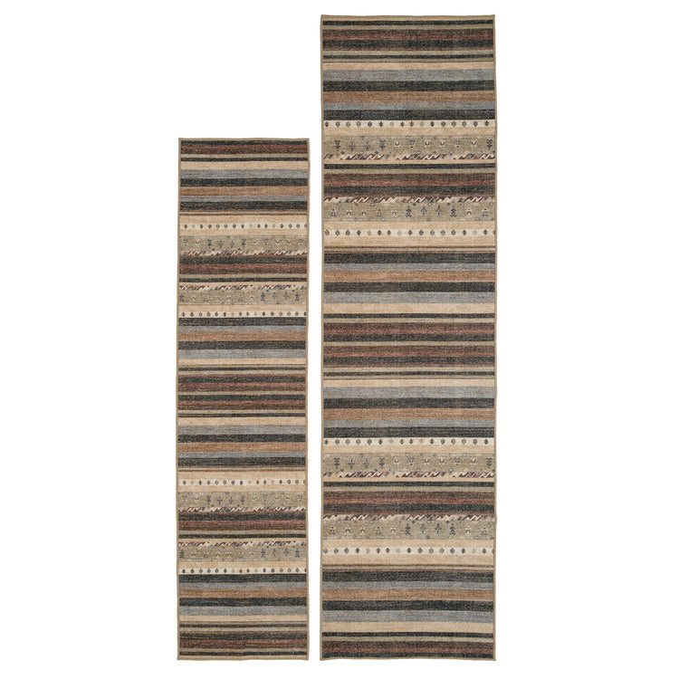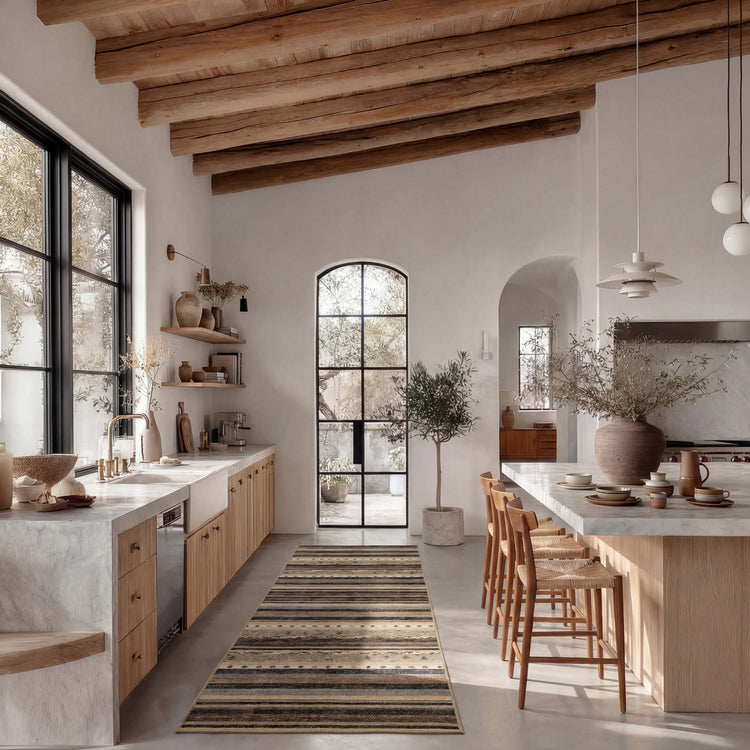 Metz draws you in with his gentle rhythm. Horizontal stripes in earthy browns, sage greens, warm neutrals and whispery blues create a calm, tonal flow. At the runner rugs heart, a central band of finely illustrated Aztec symbols adds a sense of story; like a tapestry of time gently woven into your space. It’s rustic meets refined, with a soft nod to tradition. Designed to be lived on, loved and washed, Metz brings effortless ease to everyday living.