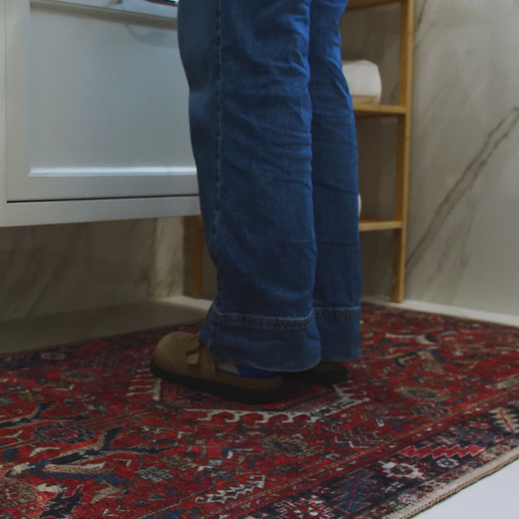 Ruddy red and navy blue symbols clash and battle on this traditional Persian inspired mat. The geometric Kazak style design is boldly detailed with unique symbols of nature, growth and prosperity.